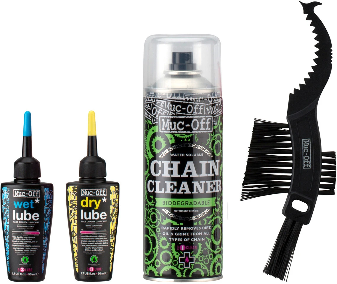 1 x Bike Cleaner, 1 litre1 x Bike Protect PTFE spray, 500 ml1 x Dry Lube1 x Wet Lube1 x Expanding Microcell sponge1 x Wheel & Com brush1 x Claw brush1 x bucket w/ grateContents:1 x Muc-Off Bucket Kit